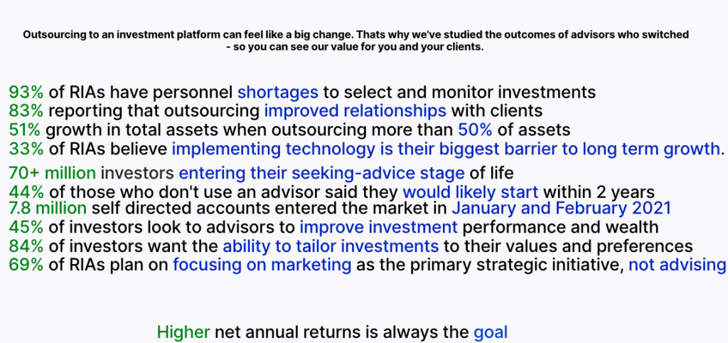 & many other MAJOR breakthroughs but to summarize, we are 1 interface – For automated custom portfolio design, next-gen investment management including normal offerings but also direct indexing, Roth conversions, rebalancing, tax loss harvesting, CRM, billing, reporting, marketing, risk assessment, advanced calculators, efficient access to easy-hedge structured investing, 401k management, crypto, alternative assets, on-boarding, client education, annual review and updates, security, compliance, sales & support. Wealth as a service.